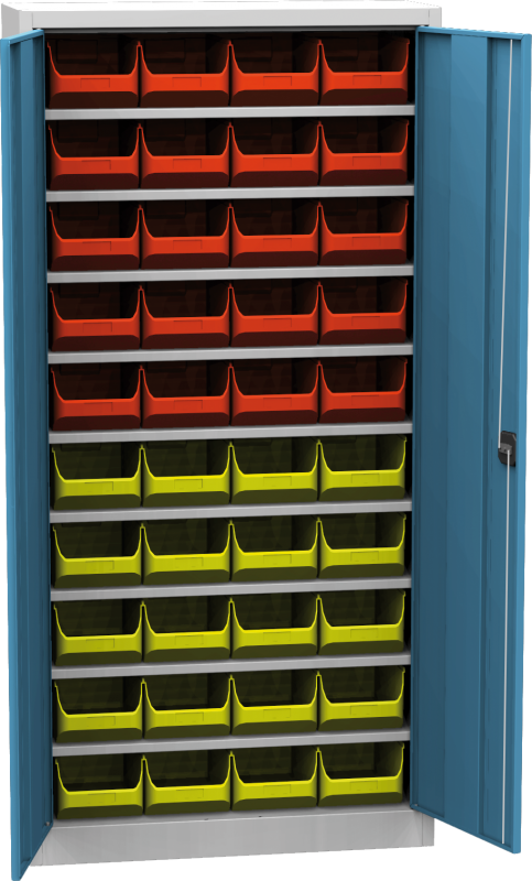 Színek: RAL 7035 halványszürke szekrénytest/ RAL 1023 sárga ajtó/RAL 3000 piros ajtó/ RAL 5012 kék ajtó/ RAL 6024 zöld ajtó/RAL 7035 világosszürke