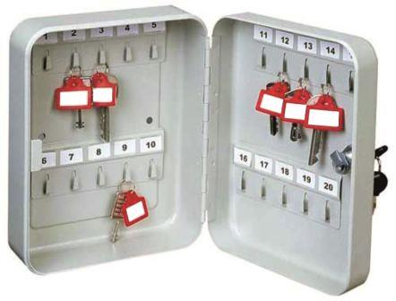 Hagyományos kulcskazetta 20 db kulcs tárolására alkalmas. Lekerekített szélű, masszív zsanérozású acéllemezből készített kulcstároló. A kulcsakasztók fixek. Igény esetén feliratozható különböző színű kulcstartó biléta rendelhető.