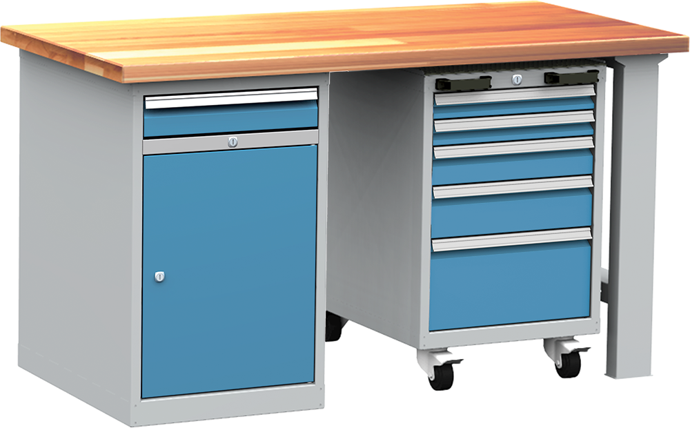 Munkapad – 1500-as lapra szerelt, fiókos szekrénnyel, műhelykocsival