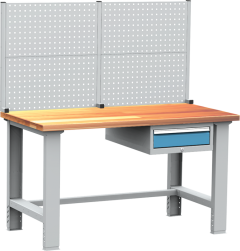 Nagy teherbírású munkapad a pad alá szerelt fiókkal, felül perforált szerszámtartó falazattal.