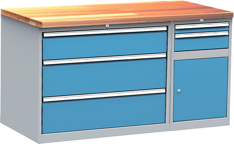 Méret: 850x 1500 x 750 mm Súly: 188,6 kg 40 mm vastag olaj kezelt bükk munkalap 1db 3 fiókos szekrénnyel (810x1000x700 mm) 1db 2fiókos és polcos szekrénnyel (810x500x700 mm) Fiók: 1x3 + 1x2 db Polc: 1 db Rozsdamentes fémbetétes zárak (2-2 db kulcs) Terhelhetőség: 500 kg Fiók terhelhetősége: 80 kg/fiók Polc terhelhetősége: 60 kg Származási hely: EU Garancia: 2 év Lapra szerelt állapotban érkezik Csomag tartalma: 1db 1500 mm-es munkalap 1db 3 fiókos szekrény 1db fiókos és ajtós (polcos) szekrény Csavarokkal és előkészített furatokkal a könnyű összeszereléshez Jobbos és balos összeszerelés egyaránt lehetséges! 3 fiókos műhelyszekrény: Méret: 810x1000x700 mm 1x180 és 2x240 mm magas fiókok Hidegen hengerelt acéllemezből készült, készre hegesztett szekrény Teljes szélességben fém fogantyúléc a fiókokon A fiókok masszív golyós síneken futnak, 80 %-ban kihúzhatók Egyszerre csak egy fiók húzható ki (billenés védelem) Központi zár nem másolható kulcsokkal, 2 db kulccsal (sorszám alapján után rendelhetők) 2 fiókos és ajtós (polcos) szekrény: Méret: 810x500x700 mm 1x60 és 1x120 mm magas fiók Hidegen hengerelt acéllemezből készült, készre hegesztett szekrény Teljes szélességben fém fogantyúléc a fiókokon A fiókok masszív golyós síneken futnak, 80 %-ban kihúzhatók Egyszerre csak egy fiók húzható ki (billenés védelem) Központi zár nem másolható kulcsokkal, 2 db kulccsal (sorszám alapján után rendelhetők) Alul szárnyas ajtós szekrény jobbra nyíló ajtóval 1 db áthelyezhető polc Az ajtón rozsdamentes, fémbetétes zár nem másolható kulcsokkal, 2 db kulccsal (sorszám alapján után rendelhetők) Egypontos záródás Szín: RAL 7035 halványszürke láb és szekrény korpusz/RAL 5012 világos kék fiók előlapok