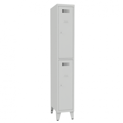 Rövid ajtós fém öltözőszekrény lábakkal. Alapszín: világosszürke