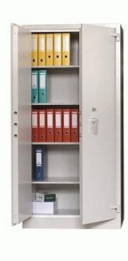 Hidegen hengerelt acéllemezből készült tűzálló irattároló szekrény Duplafalú acéllemez test és ajtó az acéllemezek között speciális, az EN 13162:2001 Euroclass A szabvány és besorolás szerint NEM ÉGHETŐ szigetelőanyaggal töltve Az ajtónyílásban körbefutó tűzgátló szigetelés a forró gázok és az oltóvíz kirekesztésére Külső zsanéros ajtó, jobbra 180⁰-ig nyitható A zár 3 irányban 5 ponton reteszel krómozott köracél csapokkal Felfúrás ellen védett zárszerkezet A polcok 25 mm-es osztásközzel áthelyezhetők Felületkezelés: ráégetett szinterezés Könnyen tisztítható, karcálló felület Szín: RAL 7035 halvány szürke